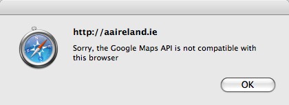But I’ll place the blame on aaireland.ie As you can see this is a Safari Browser error message, but I am betting that the AA Roadwatch folks have coded this web page for IE only usage. BAD! BAD! BAD! But further accusing Google for causing this incompatibility should net them a rebuke from Google.